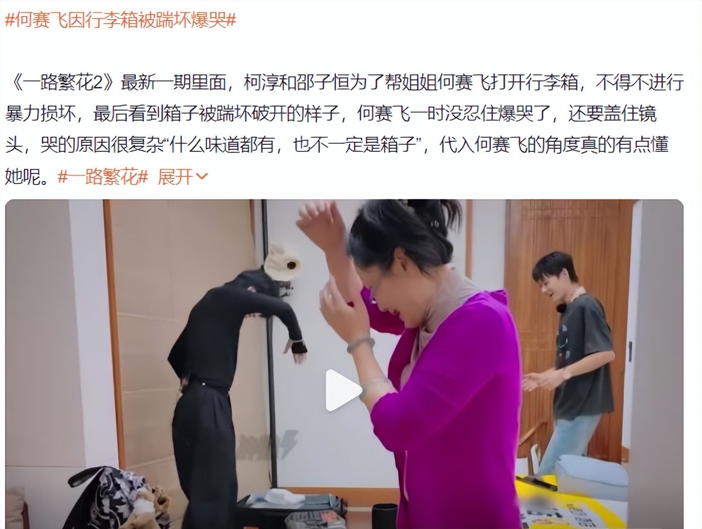 随着节目播出,“何赛飞爆哭”的话题登上热搜,看到热搜之后,网友们立即来了兴趣,因为真人秀综艺中,出现矛盾冲突,最能引起关注。